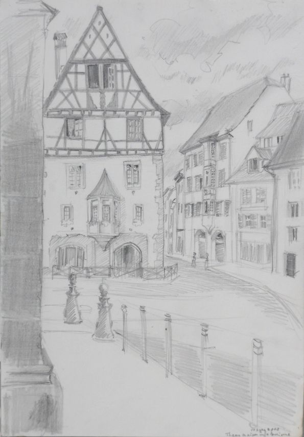 Dessin au crayon noir ordinaire d'une maison traditionnelle Vosgiènne.